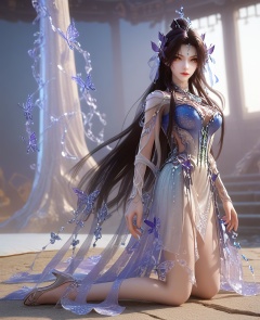 (oriental architecture, elegant decor, sophisticated style:1.1),(Kneeling by the side of the bed, one leg casually draped over the other, hands slowly tracing sensuous patterns on her naked skin, she captures the essence of pure, unadulterated eroticism:1.1),full body,(large breasts:1.2),shoes,<lora:XL16云深不知梦羲和四象归一:0.95>,miss xihe,blue-violet to white ombre gown,yellow eyes,forehead pendan,black hair,traditional chinese updo with long front strands,absurdly long hair,hair ornament,jewelry,elbow gloves,butterfly embellishments,crystal gown hemline,, score_9,score_8_up,score_7_up,score_6_up,score_5_up,score_4_up,3d rendering,tag1,tag2, Cinematic Lighting,backlighting,