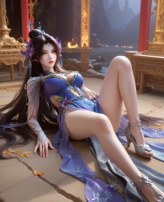 (oriental architecture, elegant decor, sophisticated style:1.1),(Lying, on back, legs raised,:1.1),worm's eye,(large breasts:1.2),shoes,<lora:XL16云深不知梦羲和四象归一:0.95>,miss xihe,blue-violet to white ombre gown,yellow eyes,forehead pendan,black hair,traditional chinese updo with long front strands,absurdly long hair,hair ornament,jewelry,elbow gloves,solo,, score_9,score_8_up,score_7_up,score_6_up,score_5_up,score_4_up,3d rendering,tag1,tag2, Cinematic Lighting,backlighting,