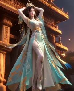 (oriental architecture, elegant decor, sophisticated style:1.1),(Raised arms, legs bent,:1.1),full body,(large breasts:1.2),shoes,<lora:XL16云深不知梦羲和四相融合:0.95>,miss xihe,cyan hanfu coat over white base dress,yellow hagoromo,yellow eyes,facial mark,black hair,half-up ponytail with long cascading hair,very long hair,hair ornament,jewelry,collar,faux floral embellishments,white leggings,white boots,, score_9,score_8_up,score_7_up,score_6_up,score_5_up,score_4_up,3d rendering,tag1,tag2, Cinematic Lighting,backlighting,