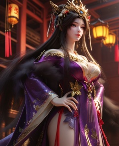 (hands-on-hips:1.1),(large breasts:1.2),<lora:XL16云深不知梦羲和醉蝶花:0.95>,miss xihe,purple gown,fur trim,mole under left eye,black hair,absurdly long hair,traditional chinese updo with long front strands,hair ornament,jewelry,floral embroidery,wide sleeves,, score_9,score_8_up,score_7_up,score_6_up,score_5_up,score_4_up,3d rendering,tag1,tag2, Cinematic Lighting,backlighting,