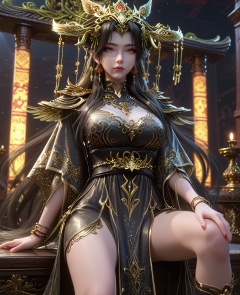 (Sitting, one knee bent, looking thoughtful,:1.1),looking at viewer,(large breasts:1.2),<lora:XL16云深不知梦炽阳瑾:0.95>,miss chiyangjin,black tiered dress,brown eyes,black hair,absurdly long hair,half-up braid with long cascading hair,hair ornament,earrings,jewelry,sash,shoulder armor,bracelet,wide sleeves,see-through overdress,clothing cutout,, score_9,score_8_up,score_7_up,score_6_up,score_5_up,score_4_up,3d rendering,tag1,tag2, Cinematic Lighting,backlighting,