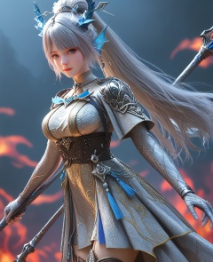 (Parkour:1.1),looking at viewer,(large breasts:1.2),<lora:XL16云深不知梦白龙漱玉:0.95>,miss shuyu,silver dress,blue eyes,mole under left eye,white hair,ponytail,very long hair,hair ornament,elbow gloves,cape,sash,thigh boots,shoulder armor,head fins ornament,holding polearm,, score_9,score_8_up,score_7_up,score_6_up,score_5_up,score_4_up,3d rendering,tag1,tag2, Cinematic Lighting,backlighting,