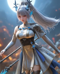 (Standing with one hand on the chest, looking proud:1.1),looking at viewer,(large breasts:1.2),<lora:XL16云深不知梦白龙漱玉:0.95>,miss shuyu,silver dress,blue eyes,mole under left eye,white hair,ponytail,very long hair,hair ornament,elbow gloves,cape,sash,thigh boots,shoulder armor,head fins ornament,holding polearm,, score_9,score_8_up,score_7_up,score_6_up,score_5_up,score_4_up,3d rendering,tag1,tag2, Cinematic Lighting,backlighting,