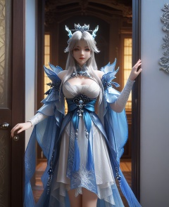 (Standing in a doorway, half in shadow, half in light, creating a mysterious mood,:1.1),looking at viewer,(large breasts:1.2),<lora:XL16云深不知梦龙儿:0.95>,miss longer,white dress with blue train,blue eyes,mole under left eye,white hair,long hair,half-up braid with long cascading hair,hair ornament,blue wide flowing sleeves,sash,opera gloves sleeves of white,crystal horns,adolescent girl,, score_9,score_8_up,score_7_up,score_6_up,score_5_up,score_4_up,3d rendering,tag1,tag2, Cinematic Lighting,backlighting,