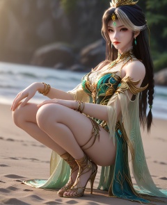(Crouching on the beach, drawing patterns in the sand, lost in creativity,:1.1),looking at viewer,(large breasts:1.2),<lora:XL16云深不知梦燕倾霏典仪司:0.95>,miss yanqingfei,green tiered gown,forehead jewel,black hair,white streaked hair,long hair,half-up braid with long cascading hair,hair ornament,earrings,jewelry,armlet,bracelet,collar,wide flowing sleeves,, score_9,score_8_up,score_7_up,score_6_up,score_5_up,score_4_up,3d rendering,tag1,tag2, Cinematic Lighting,backlighting,