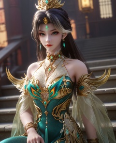 (Sitting on a staircase, head tilted, looking playful and mischievous,:1.1),looking at viewer,(large breasts:1.2),<lora:XL16云深不知梦燕倾霏典仪司:0.95>,miss yanqingfei,green tiered gown,forehead jewel,black hair,white streaked hair,long hair,half-up braid with long cascading hair,hair ornament,earrings,jewelry,armlet,bracelet,collar,wide flowing sleeves,, score_9,score_8_up,score_7_up,score_6_up,score_5_up,score_4_up,3d rendering,tag1,tag2, Cinematic Lighting,backlighting,