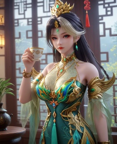 (Standing near a window, holding a cup of tea or coffee, lost in thought and relaxation,:1.1),looking at viewer,(large breasts:1.2),<lora:XL16云深不知梦燕倾霏典仪司:0.95>,miss yanqingfei,green tiered gown,forehead jewel,black hair,white streaked hair,long hair,half-up braid with long cascading hair,hair ornament,earrings,jewelry,armlet,bracelet,collar,wide flowing sleeves,, score_9,score_8_up,score_7_up,score_6_up,score_5_up,score_4_up,3d rendering,tag1,tag2, Cinematic Lighting,backlighting,