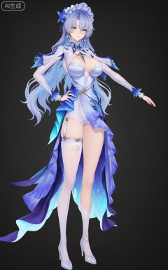 depth of field,masterpiece,best quality,very aesthetic,alternate costume,alternate costume,2024,2023,perfect composition,ultra-detailed,extreme aesthetic,masterpiece,best quality,good quality,newest,year 2024,year 2023,very aesthetic,absurdres,looking_at_viewer,colorful,<lora:坎特蕾拉:0.7>,cantarella\(wuthering waves\),clothes: cantarella blue and white dress,cantarella asymmetrical legwear,cantarella bonnet,cantarella elbow gloves,cantarella frilled hairband,cantarella high heel boots,cantarella long dress,cantarella maid headdress,cantarella multicolored dress,cantarella single white thighhigh,cantarella thigh strap,cantarella white footwear,1girl,solo,breasts,long hair,full body,looking at viewer,jewelry,earrings,smile,black background,cleavage,large breasts,simple background,grey hair,closed mouth,hair between eyes,standing,grey eyes,long sleeves,hand on hip,