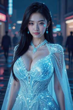 A beautiful Asian 18-year-old girl with long black hair,features are sharp,smirk,realistic skin tones and pores visible,gaze directly at the viewer,realistic skin tones and pores are clearly visible,visible fine hairs,shiny skin,fair skin,reality skin,skin texture,numerous small freckles,and her complexion is relatively fair,face natural coloration, adorned with glowing blue snowflake-like ornaments. She wears a luminous, ice-blue gown with intricate, glowing patterns that highlight her ample cleavage and slender waist. The dress has sheer, translucent sleeves that cascade down her arms. Her skin is fair and flawless, and her expression is serene yet captivating. The background is a futuristic, dimly lit urban environment with blurred, glowing neon lights and silhouetted figures. The overall style is reminiscent of a sci-fi fantasy theme, with a strong emphasis on glowing, icy aesthetics., shimmering fitted long dress, sparkling starlight necklace and earrings,