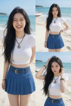 这张照片拼贴画的主角是一位留着黑色长发的亚洲女性,站在海滩。她穿着一件白色短上衣,以及一条带有黑色腰带的高腰蓝色百褶裙。她有一条带有圆形吊坠的黑色项链,左手腕上戴着多个手镯。她的妆容很自然,肤色也很白皙。拼贴画包括三幅图像:左图显示她微笑着;右上图显示她表情中性,双臂放在大腿旁;右下图显示她用手摸着头发。海滩上白色沙子,海浪,船,背景是蓝天。, 三格图, 左一格图右上下两格图, 三格图是相同的服装, 三格图是同一个女性 <lora:20260113_TinZ-ImageMultiGridLora9:1>
