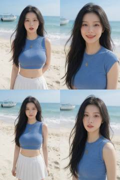 这张照片拼贴画的主角是一位留着黑色长发的亚洲女性,站在海滩。她穿着一件蓝色短上衣,以及一条带白色百褶裙。她的妆容很自然,肤色也很白皙。海滩上白色沙子,海浪,船,背景是蓝天。, 四格图, 四格图是相同的服装, 四格图是同一个女性 <lora:20260113_TinZ-ImageMultiGridLora9:1>