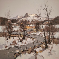 qnian,mohu,bing,winter valley at dawn,sepia oil painting,soft backlight behind mountain ridge,frozen river winding across the valley,scattered clusters of bare trees catching highlights,subtle glow diffused through cold air,textured brush strokes creating depth,serene and expansive mood,