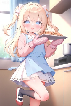 masterpiece,best quality,amazing quality,highres,absurdres,newest,very aesthetic,extreme aesthetic,very awa,petite,loli,apron, 1girl, pleated skirt, solo, smile, black socks, hair between eyes, skirt, :d, bow, hair bow, long hair, window, white bow, blush, indoors, bangs, pink sweater, socks, blue eyes, school uniform, white footwear, shoes, oven mitts, sweater, sailor collar, open mouth, white skirt, two side up, looking at viewer, cookie, serafuku, long sleeves, curtains, food, kneehighs, standing, standing on one leg, holding, blue apron, blonde hair, uwabaki, day, white sailor collar, shirt