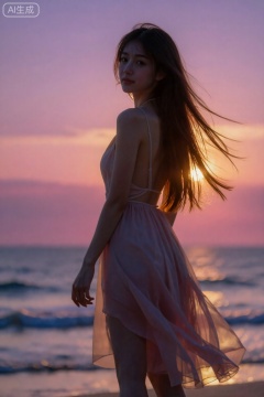 一位长发飘飘的活力女孩,在日落时分的海边。她穿着飘逸的吊带长裙,。她回头望向镜头,夕阳的余晖为她勾勒出金色的轮廓,。背景是粉紫色渐变的天空,整个画面充满电影感和治愈感。