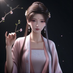 masterpiece,best quality,absurdres,highres,(glamor:1.1),(slender:1.1),skinny,<lora:苏檀儿-ill-000008:0.83>,1girl,solo,flower hair accessory,hair flower,hair ornament,long hair,half-up bun,dark brown hair,jewelry,earrings,forehead mark,brown eyes,pupils,dilated_pupils,brown_pupils,silk robe,pink robe,layered outfit,beizi,ru top,waist sash,pink,collarbone,large breasts,sutaner,looking at viewer,(front view),(ok_sign),BREAK(white_skin:1.1),(fair_skin:1.1),realistic,twig,branch,falling petals,simple background,black background,rim light,Volumetric Lighting,lens flare,Tyndall effect,depth of field,bokeh,sparkle,