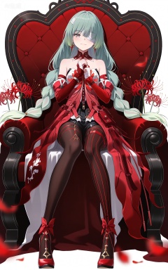 (bandage over one eye:1.2),braided ponytail,green hair,long hair,gradient hair,multicolored hair,red hair,grey eyes,red pupils,twin braids,very long hair,full red dress,rulolo strapless dress,fulolo arm ribbon,fulolo bandaged arm,fulolo red elbow gloves,fulolo fingerless gloves,fulolo red high heels,fulolo bow high heels,fulolo pantyhose,fulolo red rope,fulolo asymmetrical legwear,fulolo mismatched legwear,1girl,solo,full body,looking at viewer,earrings,jewelry,bare shoulders,smile,ribbon,simple background,closed mouth,red ribbon,fulolo thigh strap,white_background,cover,black shorts,sitting,throne,spider_lily,red theme,