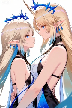 long hair,blonde hair,blue eyes,pointy_ears,french braid,parted bangs,single horn,very long hair,facial mark,katixiyabig halo,clothes:katixiyabig white an blue dress,katixiyabig short dress,katixiyabig blue cape,katixiyabig sleeveless dress,breasts,upper body,bare shoulders,jewelry,white background,earrings,large breasts,simple background,parted lips,