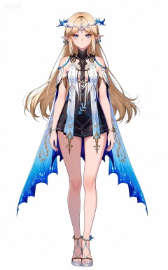 french braid,parted bangs,long hair,blonde hair,blue eyes,pointy_ears,clothes:katixiya white an blue dress,katixiya short dress,katixiya high-heeled sandals,katixiya blue cape,1girl,solo,full body,jewelry,white background,looking at viewer,standing,bare shoulders,earrings,breasts,simple background,toenails,arms at sides,toenail polish,closed mouth,blue nails,nail polish,bare legs,bracelet,toes,tachi-e,katixiya circlet,dynamic_angle,dutch angle,