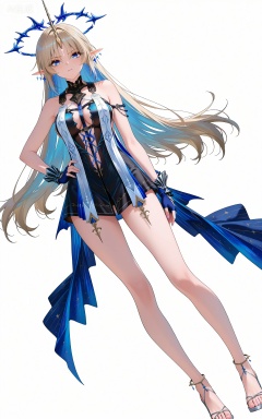 facial mark,long hair,blonde hair,blue eyes,pointy_ears,french braid,parted bangs,single horn,very long hair,katixiyabig halo,clothes:katixiyabig white an blue dress,katixiyabig short dress,katixiyabig blue cape,katixiyabig blue fingerless gloves,katixiyabig sleeveless dress,1girl,solo,barefoot,breasts,full body,jewelry,looking at viewer,white background,bare shoulders,bare legs,simple background,earrings,,toenails,toes,medium breasts,standing,closed mouth,,dutch angle,dynamic_angle,hand on hip,high heels