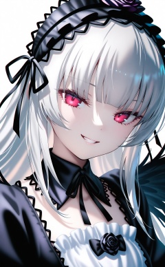 masterpiece,highres,absurdres,newest,best quality,high quality,loli,petite,chromatic_aberration,//,1girl,suigintou,solo,feathers,black_feathers,lolita_hairband,hairband,white_background,long_hair,black_hairband,looking_at_viewer,black_flower,smile,simple_background,black_wings,portrait,black_rose,white_hair,black_ribbon,ribbon,lolita_fashion,gothic_lolita,parted_lips,wings,rose,blunt_bangs,black_dress,falling_feathers,frilled_hairband,pink_eyes,red_eyes,grin,hair_ribbon,flower,dress,grey_hair,pale_skin,feathered_wings,colored_skin,//,//,<lora:MAQ——【CKXL测试】hans:1>,