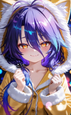 masterpiece,absurdres,best quality,high quality,chromatic_aberration,loli,petite,//,1girl,purple hair,solo,hair between eyes,long sleeves,hood,hood up,long hair,looking at viewer,hands up,closed mouth,blush,yellow eyes,multicolored hair,upper body,smile,pajamas,gradient hair,fur-trimmed sleeves,animal hood,fur trim,antenna hair,clenched hands,skin fangs,skin fang,slit pupils,hoodie,orange eyes,collarbone,blue hair,yellow hoodie,fangs,red hair,fang,blurry,jacket,//,highres,HDR,8K,high contrast,illustration,depth of field,(colorful),Tyndall effect,contrast,lens flare,//,//,<lora:nyalia——【CKXL测试】hans:1>,