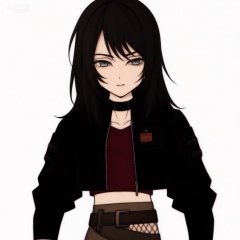 masterpiece, best quality,solo,white background,simple_background,Yahata Umiri,cybersaki_style,black hair,long hair,blue eyes,bangs,swept bangs,skirt,jewelry,jacket,earrings,choker,black jacket,red shirt,leather,leather jacket,navel,cropped jacket,android,joints,robot joints,boots,belt,black footwear,grey skirt,pencil skirt,fishnets