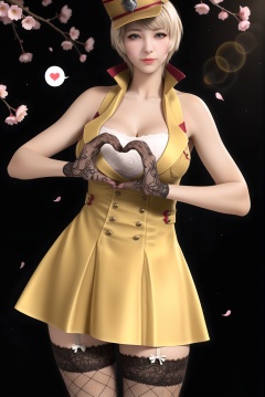 masterpiece,best quality,absurdres,highres,plump,curvy,mature female,<lora:潜-灵狐-ill:0.85>,1girl,solo,blonde hair,short hair,blue eyes,halter dress,high collar,bare shoulders,military hat,lace-trimmed legwear,fishnet thighhighs,garter straps,black gloves,lace gloves,collarbone,large breasts,heart,spoken heart,(heart hands),(cleavage cutout),cleavage, looking at viewer,(front view),BREAK(white_skin:1.1),(fair_skin:1.1),realistic,twig,branch,falling petals,simple background,black background,rim light,Volumetric Lighting,lens flare,Tyndall effect,depth of field,bokeh,sparkle,<lora:Skin color slider - Illustrious_alpha1.0_rank4_noxattn_last:-1>,