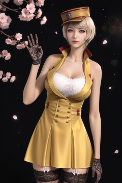 masterpiece,best quality,absurdres,highres,<lora:潜-灵狐-ill:0.8>,1girl,solo,blonde hair,short hair,blue eyes,(bright_pupils:1.1),(blue_pupils:1.1),halter dress,white bra,lace bra,high collar,bare shoulders,military hat,lace-trimmed legwear,fishnet thighhighs,garter straps,black gloves,lace gloves,collarbone,large breasts,cleavage,looking at viewer,(front view),(ok_sign),BREAK(white_skin:1.1),(fair_skin:1.1),realistic,twig,branch,falling petals,simple background,black background,rim light,Volumetric Lighting,lens flare,Tyndall effect,depth of field,bokeh,sparkle,