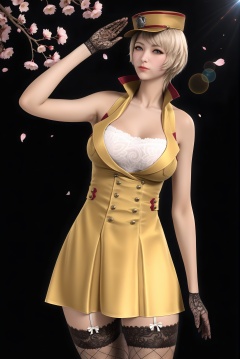 masterpiece,best quality,absurdres,highres,plump,curvy,mature female,<lora:潜-灵狐-ill-000009:0.85>,1girl,solo,blonde hair,short hair,blue eyes,linghuzhe,halter dress,white bra,lace bra,high collar,bare shoulders,military hat,lace-trimmed legwear,fishnet thighhighs,garter straps,black gloves,lace gloves,collarbone,(salute:1.1),looking at viewer,(front view),BREAK(white_skin:1.1),(fair_skin:1.1),realistic,twig,branch,falling petals,simple background,black background,rim light,Volumetric Lighting,lens flare,Tyndall effect,depth of field,bokeh,sparkle,