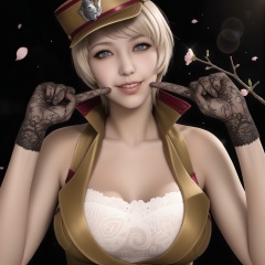 masterpiece,best quality,absurdres,highres,plump,curvy,mature female,<lora:潜-灵狐-ill:0.83>,1girl,solo,blonde hair,short hair,blue eyes,linghuzhe,pupils,bright_pupils,(blue_pupils),halter dress,white bra,lace bra,high collar,bare shoulders,military hat,black gloves,lace gloves,collarbone,upper body,(fingersmile:1.1),looking at viewer,(front view),BREAK(white_skin:1.1),(fair_skin:1.1),realistic,twig,branch,falling petals,simple background,black background,rim light,Volumetric Lighting,lens flare,Tyndall effect,depth of field,bokeh,sparkle,<lora:IL反差:1>,