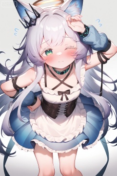 masterpiece, best quality, highly detailed,masterpiece, best quality, highly detailed,1girl, solo, loli,petite,rosmontis (arknights),1girl, purple hair, fox ears, animal ears, winking, one eye closed, blushing, looking at viewer, hand on head, halo, crown, blue dress, corset, frills, ribbon, bow, criss-cross lacing, ruffled skirt, apron, arm warmers, choker, collar, bare legs, cowboy shot, bending over, hand on hip,