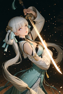 masterpiece,best quality,amazing quality,very aesthetic,absurdres,newest,highres,1girl,jinhsi (wuthering waves),from side,beautiful detailed eyes,dynamic pose,dark,warm light,looking at viewer,hanfu,holding weapon,eyes glow,weapon i cover half of my face in front of my chest,