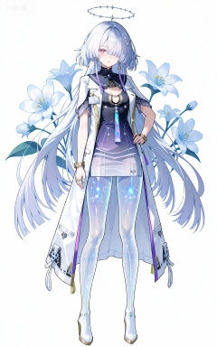 depth of field,masterpiece,best quality,very aesthetic,alternate costume,alternate costume,2024,2023,perfect composition,ultra-detailed,extreme aesthetic,masterpiece,best quality,good quality,newest,year 2024,year 2023,very aesthetic,absurdres,looking_at_viewer,colorful,,long hair,grey hair,white hair,blunt bangs,mechanical halo,very long hair,hair over one eye,moning white and black short dress,moning gradient dress,moning white coat,moning coat on shoulders,moning sailor collar,moning see through legs,moning high heel boots,1girl,solo,full body,jewelry,white background,looking at viewer,bracelet,earrings,hair ornament,simple background,clothing cutout,cleavage cutout,breasts,tachi-e,standing,hand on hip,flower background,