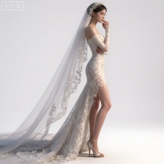 mumu white wedding dress, mumu bride veil, mumu elbow gloves, mumu long dress, mumu off shoulder dress, mumu strapless dress, 1girl, solo, high heels, crossed legs, realistic, white background, bare shoulders, breasts, simple background, white footwear, legs, toes, full body, collarbone, blonde hair, short hair, detached sleeves,站立,侧面视角,