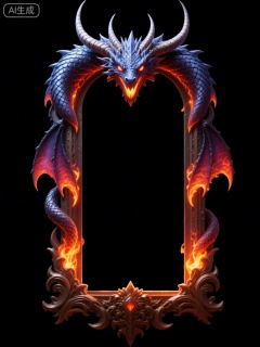 A dragon with glowing red eyes and fiery wings forms an ornate, arched frame. Its body coils around the sides of a tall rectangular opening, surrounded by flames that dance along its scales. At the base is intricate carvings adorned with a central gemstone. The entire design exudes power and majesty against a black background.