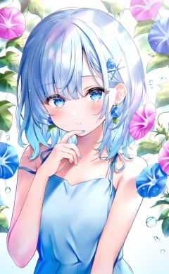 masterpiece,absurdres,best quality,high quality,chromatic_aberration,//,1girl, solo, flower, blue eyes, purple flower, hair ornament, morning glory, earrings, blue nails, looking at viewer, jewelry, flower earrings, blue flower, water drop, blue hair, pink flower, dress, blush, hairclip, nail polish, collarbone, medium hair, closed mouth, x hair ornament, upper body, blurry, sleeveless, blue dress, bare shoulders, bud, short hair, sleeveless dress, plant, fingernails, light blue hair, leaf, blurry background//,//,<lora:nekoyashiki_pushio——【CKXL】hans:1>,