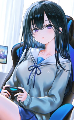 masterpiece,absurdres,best quality,high quality,chromatic_aberration,//,1girl,holding_controller,solo,controller,black_hair,game_controller,holding_game_controller,purple_eyes,long_hair,playstation_controller,swivel_chair,school_uniform,holding,sailor_collar,gaming_chair,sitting,looking_at_viewer,curtains,chair,gamepad,blue_ribbon,long_sleeves,ribbon,skirt,parted_lips,cardigan,serafuku,breasts,white_sailor_collar,indoors,collarbone,blue_skirt,on_chair,neck_ribbon,hair_between_eyes,medium_breasts,pleated_skirt,office_chair,shirt,window,playing_games,open_mouth,//,//,<lora:nekoyashiki_pushio——【CKXL】hans:1>,