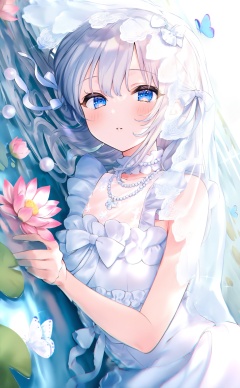 masterpiece,absurdres,best quality,high quality,chromatic_aberration,//,1girl, lily pad, solo, veil, dress, flower, white hair, lying, bug, blue eyes, white dress, looking at viewer, lotus, butterfly, parted lips, choker, jewelry, white choker, frills, sleeveless, ribbon, blush, bow, pearl necklace, water, partially submerged, frilled dress, necklace, white ribbon, white bow, beads, sleeveless dress, pearl (gemstone), long hair, on side, frilled choker, sparkle, upper body, bridal veil, dutch angle, on stomach, hair ribbon, pink flower//,//,<lora:nekoyashiki_pushio——【CKXL】hans:1>,
