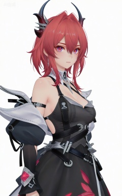 depth of field,masterpiece,best quality,very aesthetic,alternate costume,alternate costume,2024,2023,perfect composition,ultra-detailed,extreme aesthetic,masterpiece,best quality,good quality,newest,year 2024,year 2023,very aesthetic,absurdres,looking_at_viewer,colorful,,red hair,long hair,demon horns,purple eyes,red eyes,slit pupils,hair between eyes,hair intakes,laiwanting chest strap,laiwanting detached collar,laiwanting balck and red dress,laiwanting detached sleeves,laiwanting puffy sleeves,laiwanting off shoulder dress,1girl,solo,looking at viewer,breasts,bare shoulders,white background,simple background,cleavage,medium breasts,open clothes,cowboy_shot,