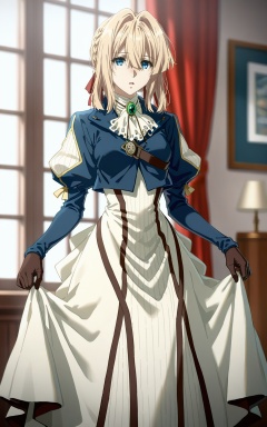 depth of field,masterpiece,best quality,very aesthetic,alternate costume,alternate costume,2024,2023,perfect composition,ultra-detailed,extreme aesthetic,(quasarcake:0.7),masterpiece,best quality,good quality,newest,year 2024,year 2023,very aesthetic,absurdres,looking_at_viewer,colorful,<lora:薇尔莉特ILL:0.8>,violet evergarden,blonde hair,blue eyes,short hair,hair ribbon,red ribbon,braid,braided bun,french braid,braided bun,weimei white ascot,weimei green gem brooch,weimei blue and white jacket,weimei juliet sleeves,weimei puffy sleeves,weimei cropped jacket,weimei brown gloves,weimei high-waist skirt,weimei long skirt,weimei skirt hold,1girl,solo,window,white ascot,curtains,indoors,jewelry,looking at viewer,lapel pin,open mouth,medium hair,standing,