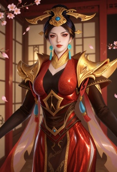 (cowboy shot:1.2),looking at viewer:1.1,masterpiece,(best quality),smog,Dark room,dim lighting,peach blossom,falling petals,<lora:YQ_Illustrious光辉v5_芈月_V1:0.8:lbw=1,1,1,1,1,1,1,1,1,0.8,0.8,0.1>,q1528437228,1girl,earrings,jewelry,solo,hair ornament,dress,red dress,makeup,red lips,brown hair,black hair,armor,eyeshadow,chinese clothes,long sleeves,shoulder armor,brown eyes,red eyes,hair bun,single hair bun,tassel,