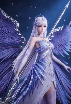 (cowboy shot:1.2),looking at viewer:1.1,masterpiece,(best quality),smog,Dark room,dim lighting,peach blossom,falling petals,<lora:YQ_Illustrious光辉v5_圣采儿_服装7_带翅膀和武器_V1:0.8:lbw=1,1,1,1,1,1,1,1,1,0.8,0.8,0.1>,q1528437228,1girl,solo,wings,long hair,dress,white hair,weapon,multiple wings,white dress,hair ornament,holding weapon,feathered wings,gloves,high heels,elbow gloves,jewelry,purple eyes,purple wings,blue dress,blue eyes,holding scythe,blunt bangs,polearm,white gloves,blue wings,thighhighs,bracelet,earrings,feathers,holding polearm,