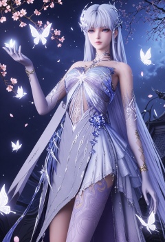 (cowboy shot:1.2),looking at viewer:1.1,masterpiece,(best quality),smog,Dark room,dim lighting,peach blossom,falling petals,<lora:YQ_Illustrious光辉v5_圣采儿_服装7_无翅膀和武器_V1:0.8:lbw=1,1,1,1,1,1,1,1,1,0.8,0.8,0.1>,q1528437228,1girl,solo,dress,long hair,white hair,hair ornament,gloves,high heels,purple eyes,elbow gloves,blue eyes,jewelry,blue dress,blunt bangs,pantyhose,white dress,purple dress,thighhighs,white gloves,purple pantyhose,thighs,earrings,purple footwear,purple gloves,blue hair,purple hair,bracelet,purple thighhighs,strapless dress,