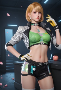 (cowboy shot:1.2),looking at viewer:1.1,masterpiece,(best quality),smog,Dark room,dim lighting,peach blossom,falling petals,<lora:YQ_Illustrious光辉v5_茉莉_V1:0.8>,q1528437228,1girl,blonde hair,jacket,short hair,solo,gloves,jewelry,cropped jacket,crop top,earrings,choker,shorts,short shorts,open jacket,black shorts,boots,dog tags,knee pads,blue eyes,necklace,white gloves,belt,