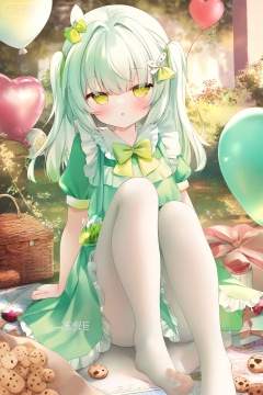 chen_bin,1girl, balloon, bow, bowtie, cookie, dress, food, green bow, green dress, green eyes, green hair, green ribbon, hair ornament, heart balloon, long hair, looking at viewer, pantyhose, parted lips, pouch, ribbon, short sleeves, solo, watermark, white pantyhose, yellow bow, yellow bowtie