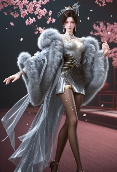 (full_body:1.1),looking at viewer:1.1,masterpiece,(best quality),smog,Dark room,dim lighting,peach blossom,falling petals,<lora:YQ_Illustrious光辉v5_南宫仙儿_V1:0.8>,q1528437228,1girl,solo,jewelry,earrings,long hair,hair ornament,brown hair,dress,black hair,blue eyes,hair bun,bracelet,pantyhose,white dress,chinese clothes,fur coat,long sleeves,fur trim,black pantyhose,single hair bun,black footwear,high heels,shoes,coat,ponytail,short hair,brown pantyhose,grey eyes,hair stick,ring,
