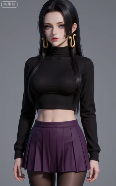 1girl,breasts,skirt,solo,pantyhose,large breasts,purple skirt,covered navel,long sleeves,taut clothes,miniskirt,pleated skirt,turtleneck,black shirt,shirt,black pantyhose,taut shirt,