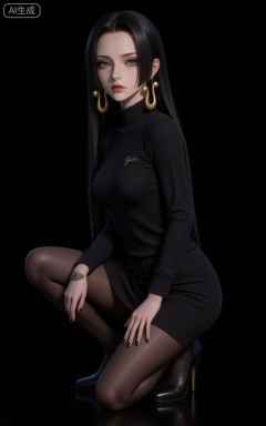 1girl,solo,pantyhose,high heels,looking at viewer,black footwear,squatting,sweater,full body,parted lips,black sweater,earrings,signature,black nails,long sleeves,parted bangs,jewelry,pencil skirt,skirt,bangs,turtleneck,nail polish,black pantyhose,dress,(Black background:1.2),simple background,