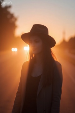 filmmood, an ethereal backlit shot of a woman in a fedora standing on a road at sunset. The light source (likely car headlights or low sun) is directly behind her, creating a heavy, warm haze and lens flare that obscures facial details but outlines her silhouette in a golden rim light. The atmosphere is dreamlike, nostalgic, and hazy, capturing a fleeting cinematic memory.