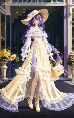 1girl, flower, blonde hair, solo, hat, dress, long hair, jewelry, holding, yellow dress, bag, holding flower, earrings, hat flower, yellow flower, full body, handbag, standing, bare shoulders, holding bag, yellow footwear, see-through, looking at viewer, sun hat, high heels, pink flower, yellow headwear, 1